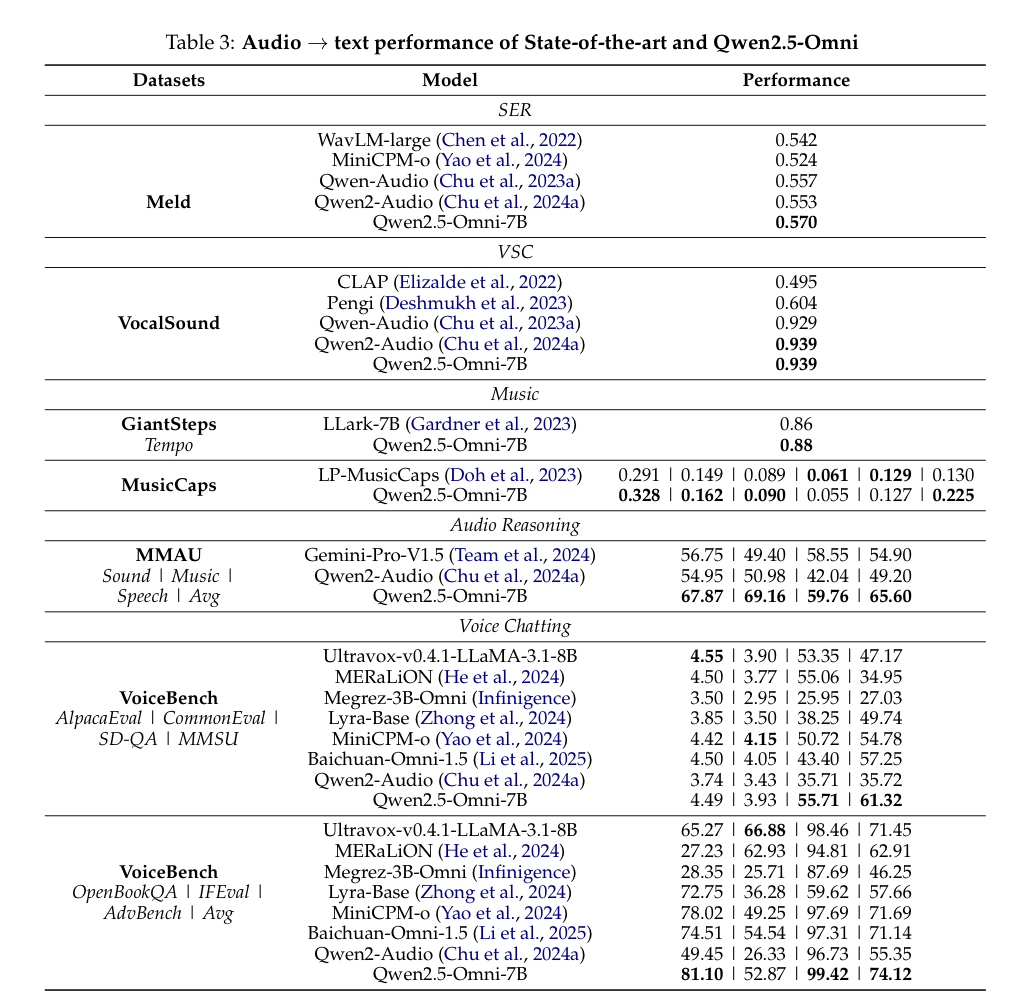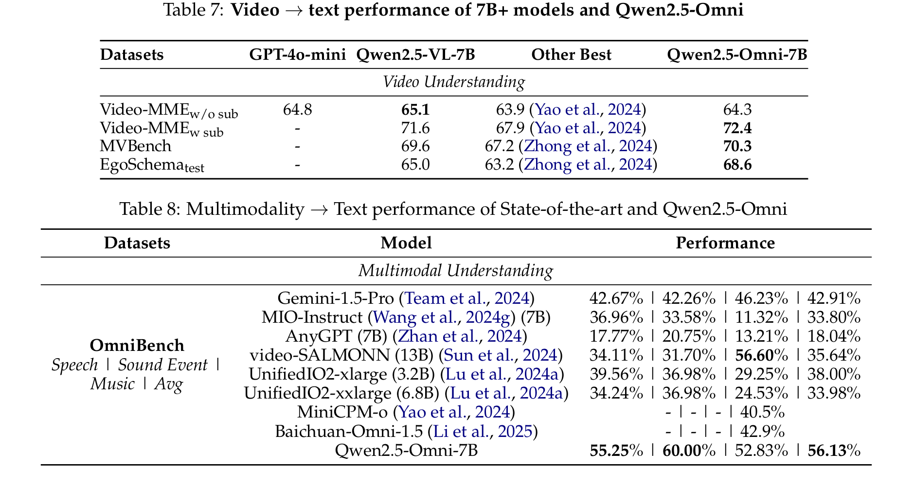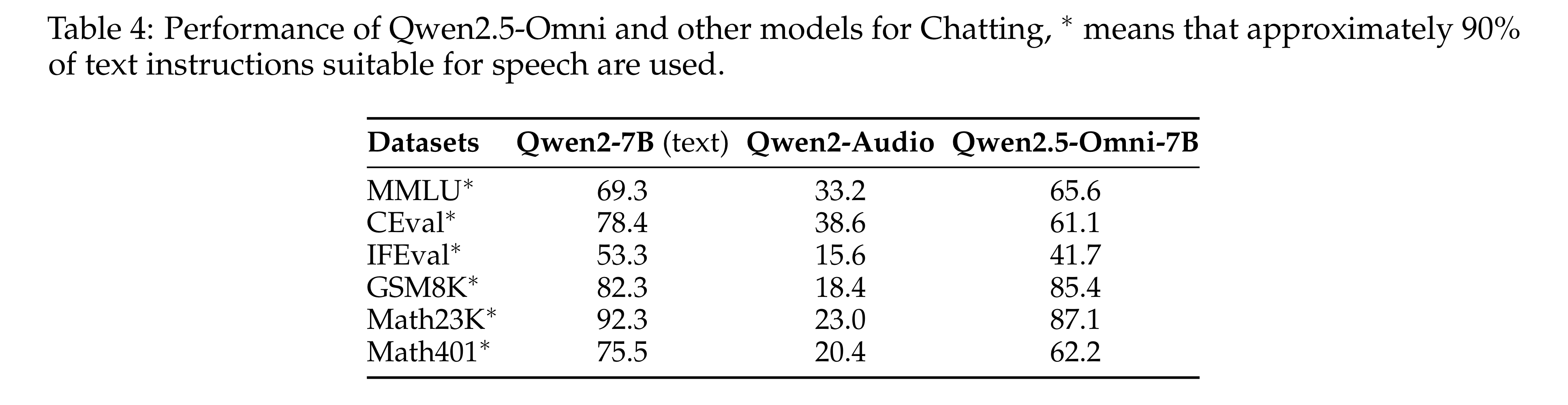 - 비슷한 크기(7B)와 비교했을 때, 성능이 대체로 Qwen2 < Qwen2.5-Omni < Qwen2.5 를 보임