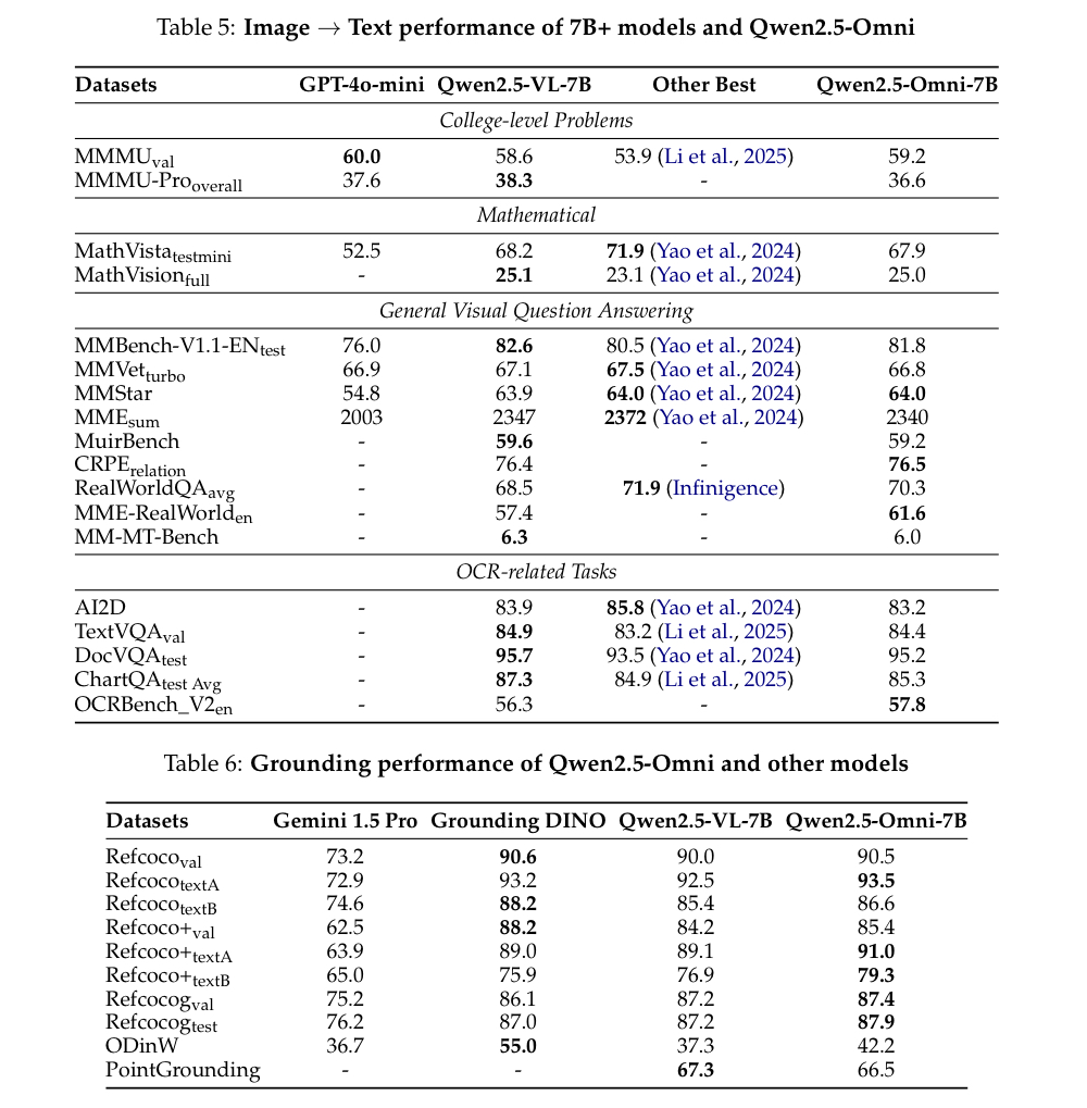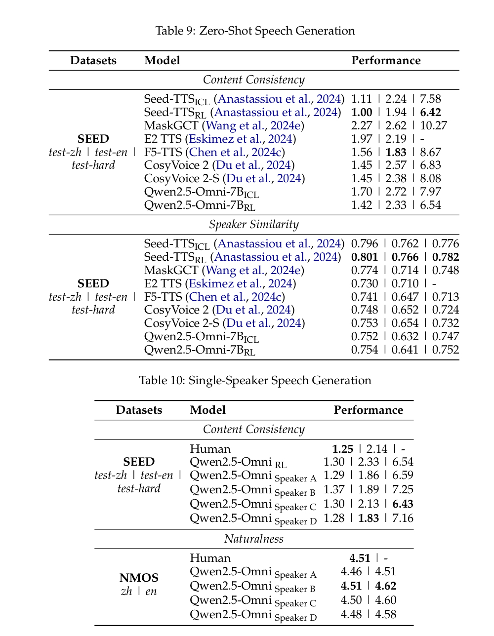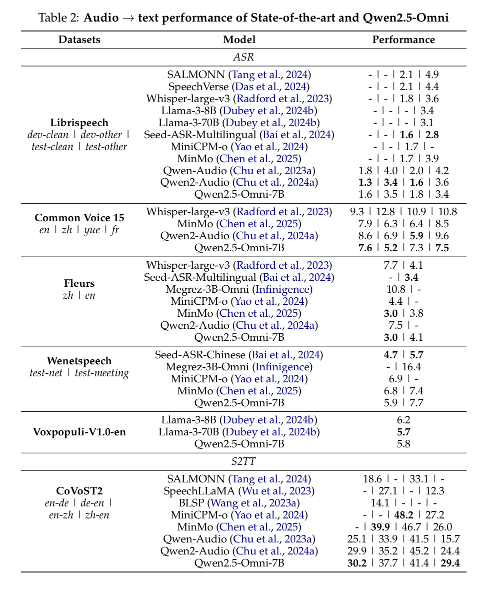 - 비슷한 크기(7B)와 비교했을 때, 성능이 대체로 Qwen2 < Qwen2.5-Omni < Qwen2.5 를 보임